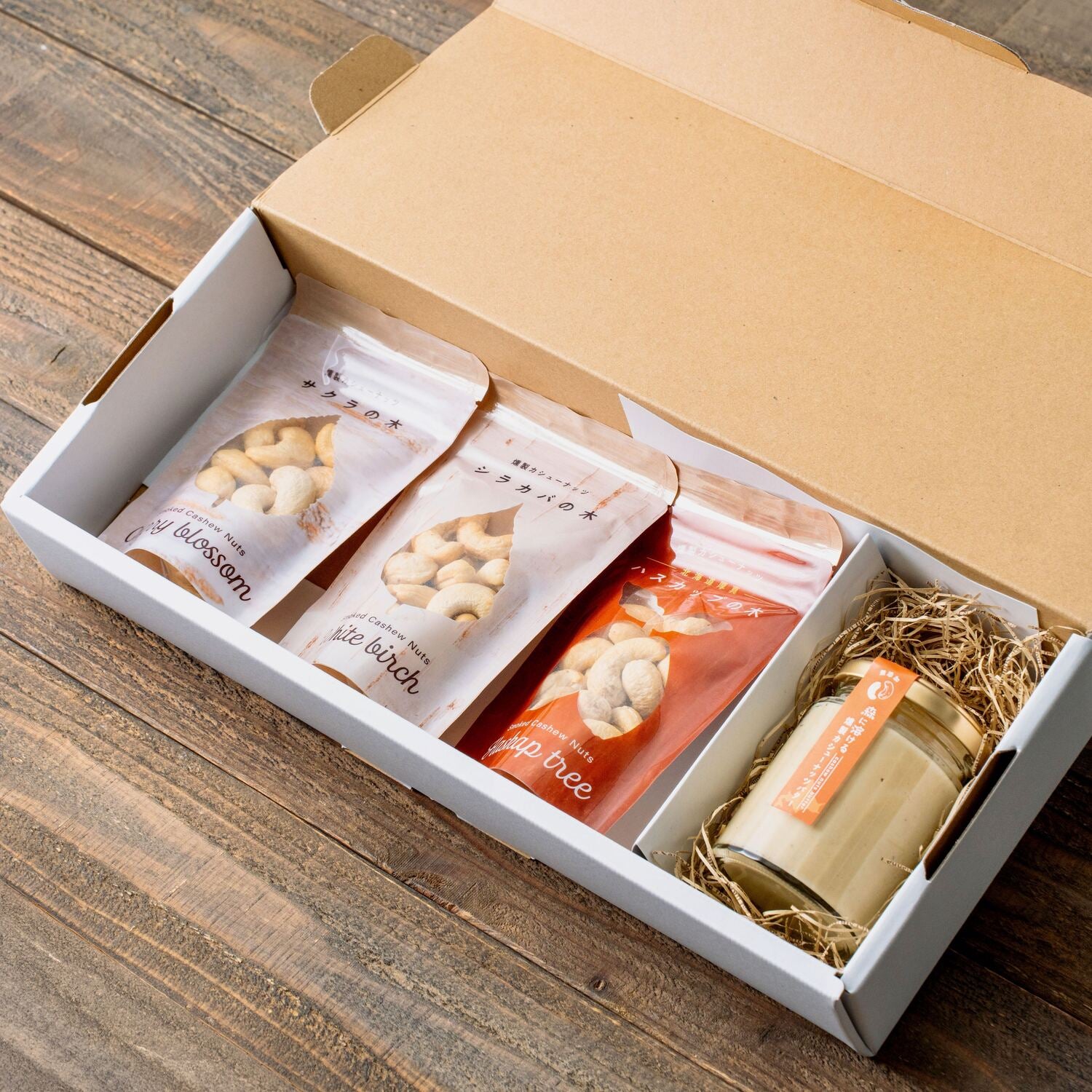 サクラ、シラカバ、ハスカップの3種の燻製カシューナッツに、やさしい甘みと薫香がとけ合う燻製バターを組み合わせたセットです。木の違いが生む香りの変化と、バターならではのなめらかな口どけ。“粒” と “バター”、二つの形で素材の魅力を楽しめます。ナチュラルなパッケージは贈り物にもぴったり。大切な方への手土産や、自分への小さなご褒美にどうぞ。