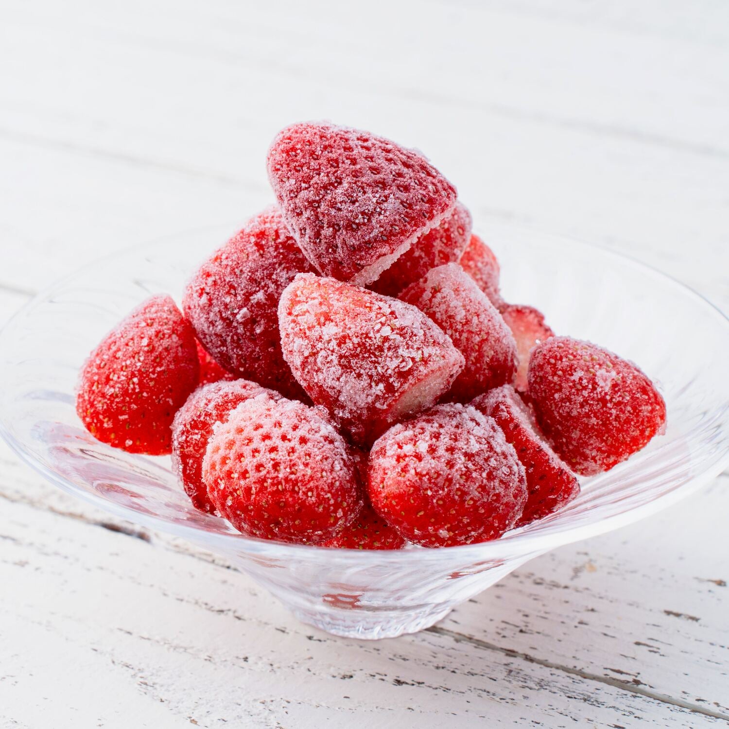 冷凍いちごとは思えないほど、フレッシュな香りと口どけが特徴。解凍すれば果汁がとろりとあふれ、ヨーグルトやアイスのトッピングにぴったりです。凍ったままスムージーやシェイクにすれば、濃厚で贅沢なひんやりスイーツに。ジャムやコンポートなどの加工にも向いており、いちご本来の自然な甘酸っぱさを活かしたお菓子作りが楽しめます。